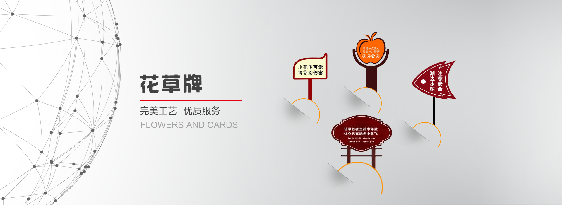 花草牌是指樹立在花草叢中用于提示愛護(hù)的標(biāo)識牌。又稱牌或草牌,屬于溫馨提示的范疇。花草牌一般較矮,一般高度在40公分到1.2米之間,是雙面,厚度一般是4公左右。有鋼板的,有純實木的,或上述材質(zhì)相互結(jié),制作工藝為: